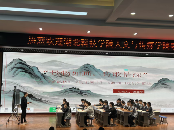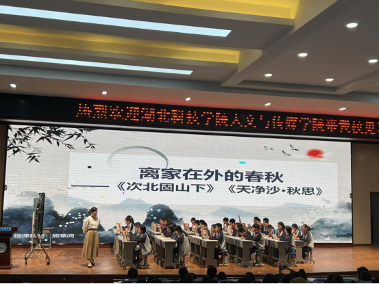 此次见习以“中学语文诗歌联读教学”为核心,咸宁市泉都学校两位青年教师分别呈现了两节设计精巧、特色鲜明的示范课。其中,熊章阅老师以《次北固山下》与《天净沙·秋思》为教学载体,创新采用“多感官体验法”引导学生解读乡愁:从“味觉”切入,让学生以“微酸”形容王湾思乡中的乐观,以“浓苦”定义马致远漂泊的悲怆;借助“视觉”对比并通过AI生成动态朗读视频,呈现出春日离家负前程恢宏之景和秋日漂泊愁断肠的悲凄之景这两幅全然不同的画面,帮助学生理解“大景衬豪情”“小景抒哀情”的差异;结合“听觉”联动,搭配古筝琵琶合奏与如泣如诉的弦乐,让学生在配乐朗诵中精准把握诗歌情感基调,巧妙渗透“以乐景写哀情”等文学手法。