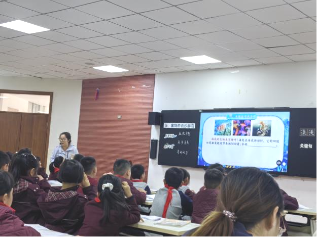 活动伊始,咸宁实验外国语学校刘小青老师主持开场,简要介绍流程后,曹宁老师率先执教三年级课文《富饶的西沙群岛》。课堂以“跟着课本旅行”为线索,通过自由朗读引导学生定位中心句,并巧妙渗透段落分析方法,在第五段进行示范后鼓励学生自主实践。教学中穿插多样朗读形式,结合视频资源增强情境体验,并在“浅”“淡”等生字教学中融入写字指导与多元评价。课堂尾声,学生通过分组朗读、句子仿写巩固学习成果,整体环节清晰有序,为后续课程内容埋下铺垫。
