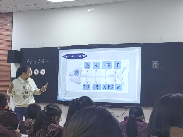 第二节课由魏清倩老师讲授文言文《杨氏之子》。魏老师的课堂以“读—懂—好—思”为逻辑主线,通过任务驱动推进教学学生先通过注释理解文意,重点突破“禽”字的形义辨析与句读把握;随后在配乐朗读中体会文言韵味,读准、读懂、读好,并通过批注探究杨氏子的“聪慧”之处。课堂巧妙设计“假设应答”与对比感悟环节,引导学生深入感悟人物礼貌与智慧,并推荐拓展阅读《世说新语》,实现文本的迁移与升华。