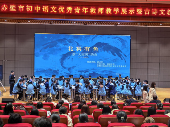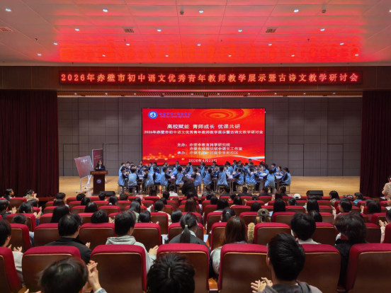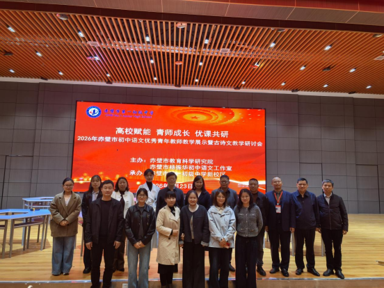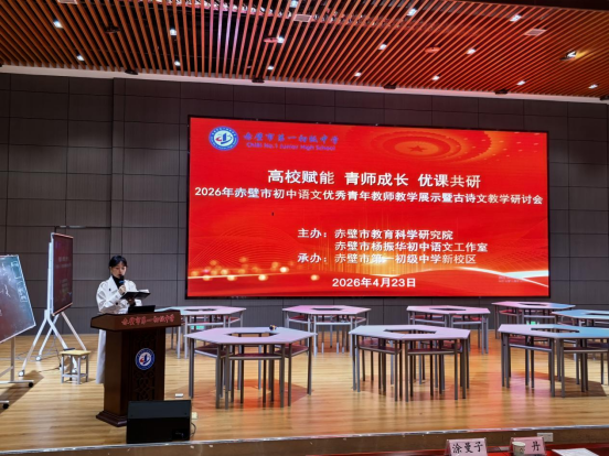 (通讯员 从朝森) 2026年4月23日下午,赤壁市第一初级中学新校区报告厅内书声琅琅、古韵悠悠。由赤壁市教育科学研究院与赤壁市杨振华初中语文工作室联合主办的 “高校赋能青师成长,优课共研——2026年赤壁市初中语文优秀青年教师教学展示暨古诗文教学研讨会” 在此举行。正值千亿QY88官网汉语言文学专业见习周,我院25级汉语言文学专业近200名学子走进中学课堂,完成了两节高品质课堂的观摩学习,在现场深入感受了大学理论教学与中学一线课堂的深度碰撞。本次活动特邀赤壁市杨振华初中语文工作室两位优秀青年教师进行展示。