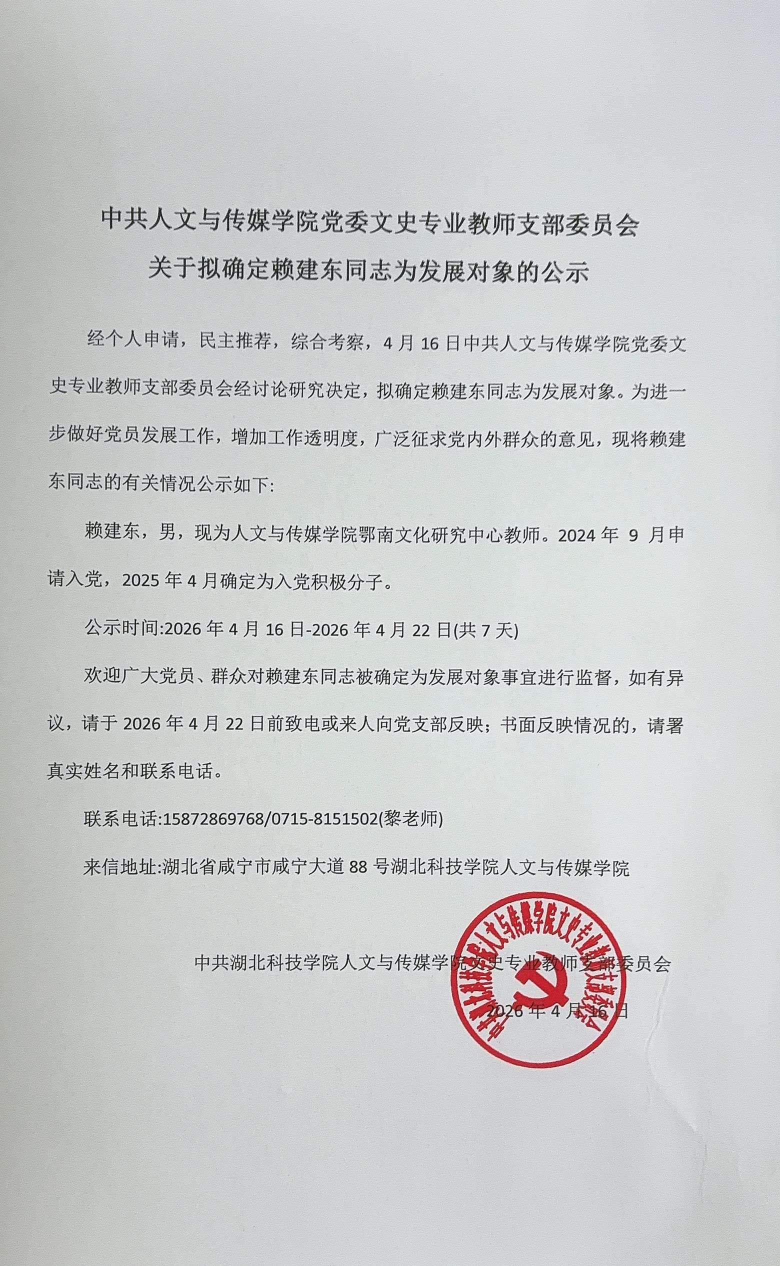 中共千亿QY88官网党委文史专业教师支部委员会关于拟确定赖建东同志为发展对象的公示
